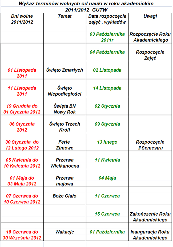 Wykaz terminów wolnych od nauki w roku akademickim 2011/2012 GUTW